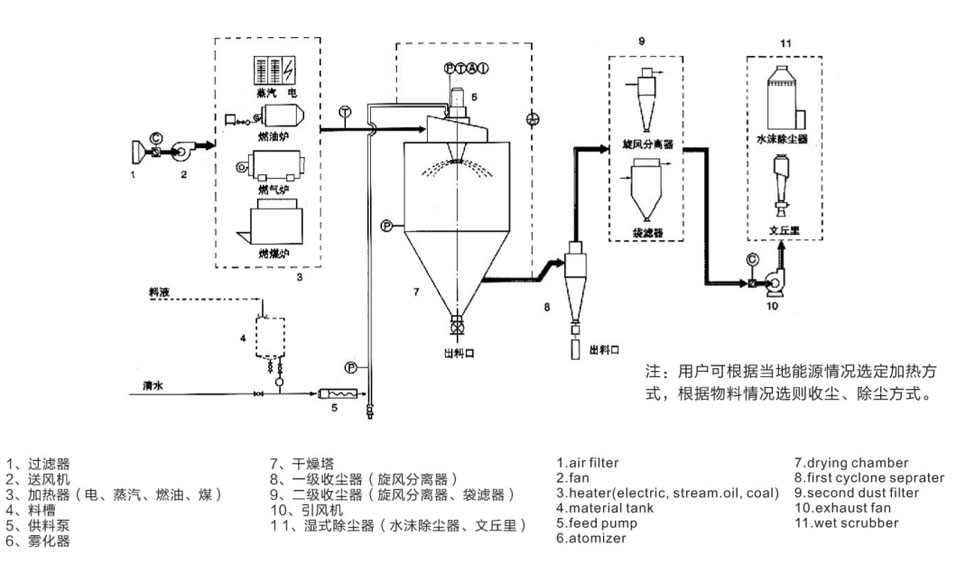 噴霧干燥機(jī)為開式循環(huán),并流式,離心式霧化。干燥介質(zhì)空氣經(jīng)過初、中效空氣過濾器過濾后根據(jù)操作指令由鼓風(fēng)機(jī)吸取再經(jīng)加熱器加熱通過高效過濾器的熱風(fēng)分配器進(jìn)入噴霧干燥主塔。液體物料根據(jù)操作指令經(jīng)過蠕動泵,進(jìn)入高速旋轉(zhuǎn)的離心噴頭,在離心力作用下被分散成小霧滴。在噴霧干燥主塔內(nèi),小霧滴與熱風(fēng)在充分接觸,沿其特定路徑進(jìn)行熱交換后被干燥成為產(chǎn)品,然后通過旋風(fēng)分離器實(shí)現(xiàn)分離,固體物料被收集,氣體介質(zhì)再經(jīng)過過濾后被排出。整套噴霧系統(tǒng)易清潔、無死角,符合GMP要求。